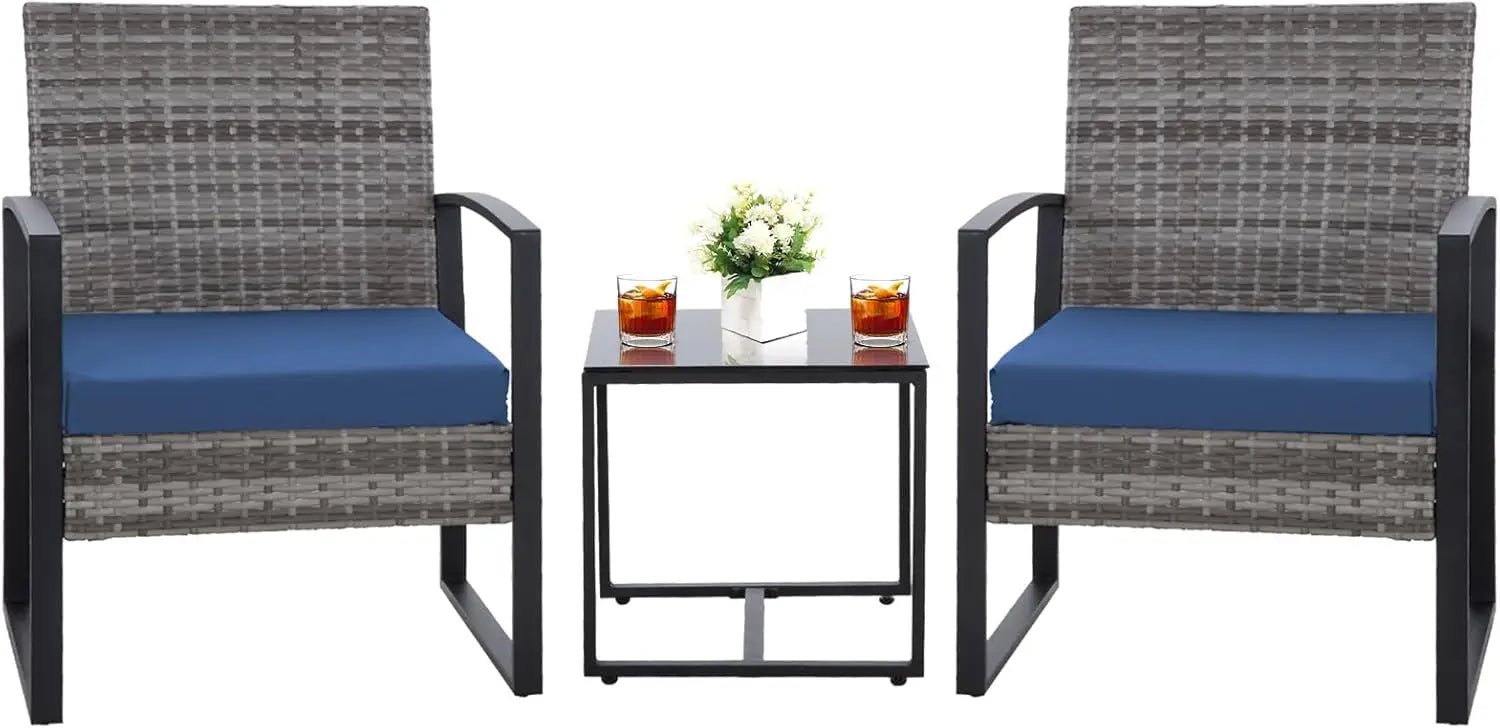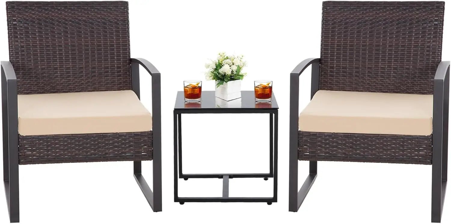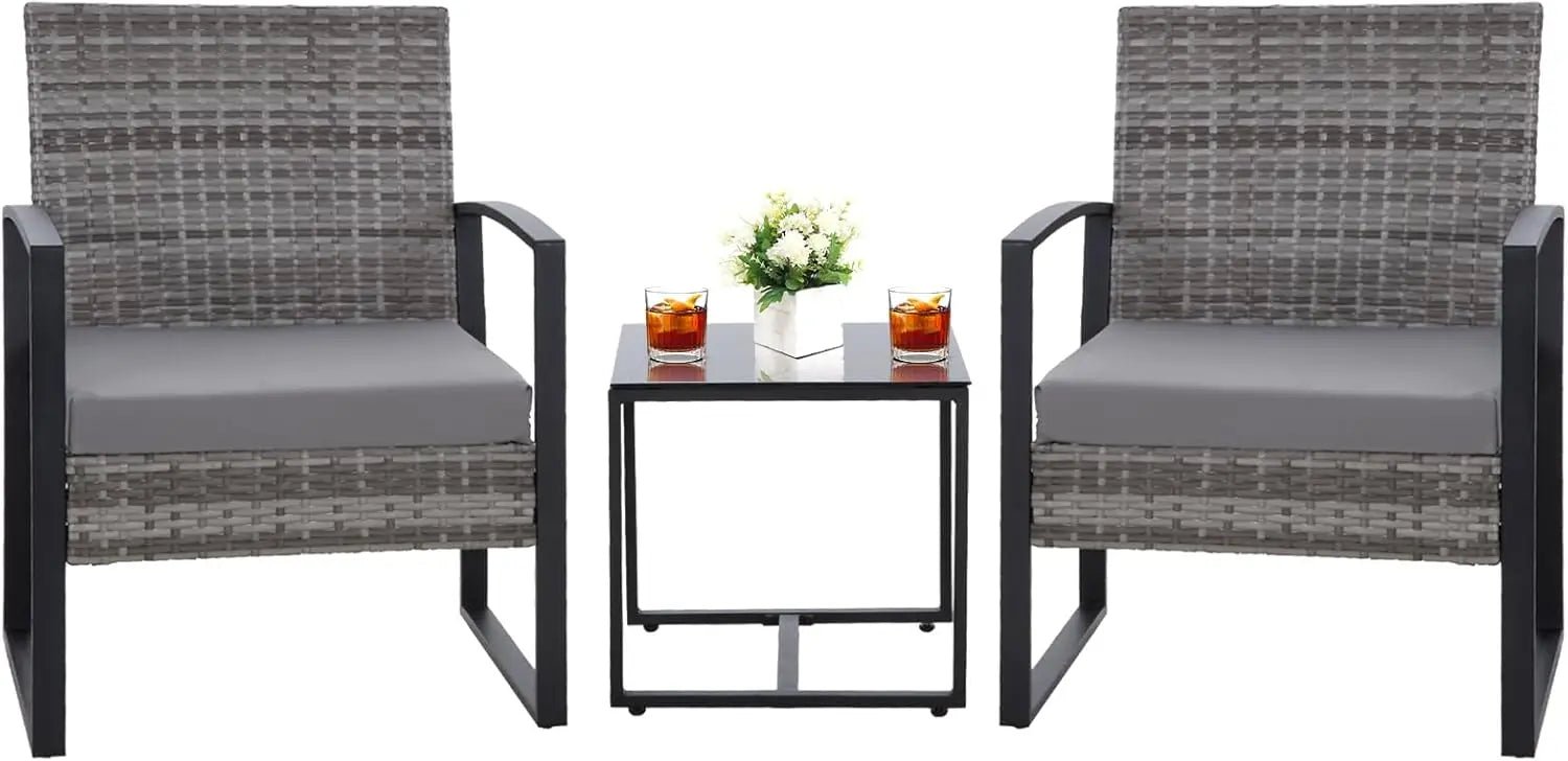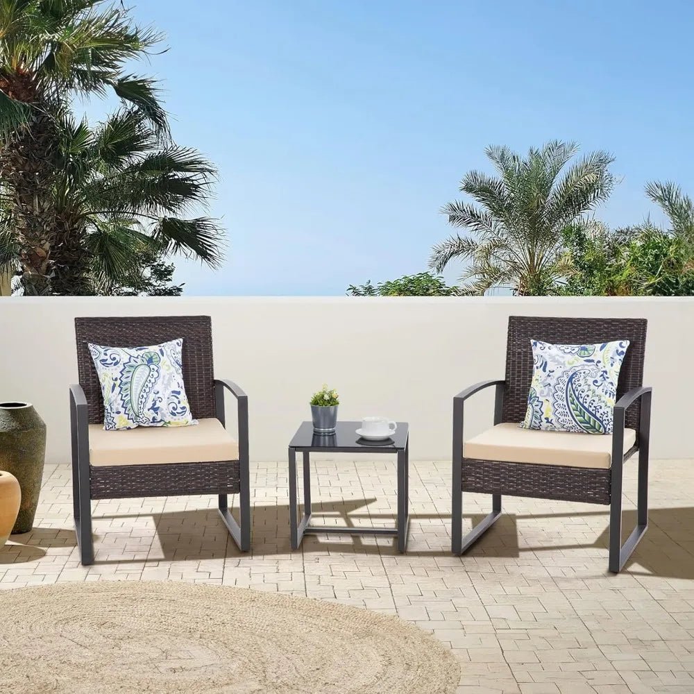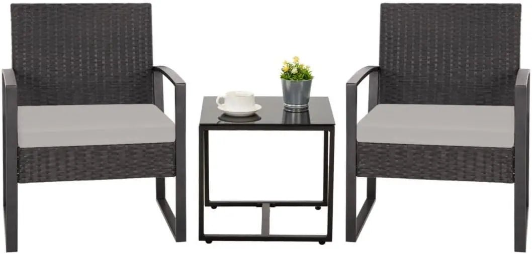 Transform your outdoor space into a stylish retreat with this 3PCS Patio Furniture Set. Featuring a modern wicker bistro style, the set includes two comfortable chairs and a matching glass-top side table. Whether you’re enjoying a morning coffee or evening conversation, this sleek, weather-resistant design brings comfort and charm to your garden, balcony, porch, or patio.